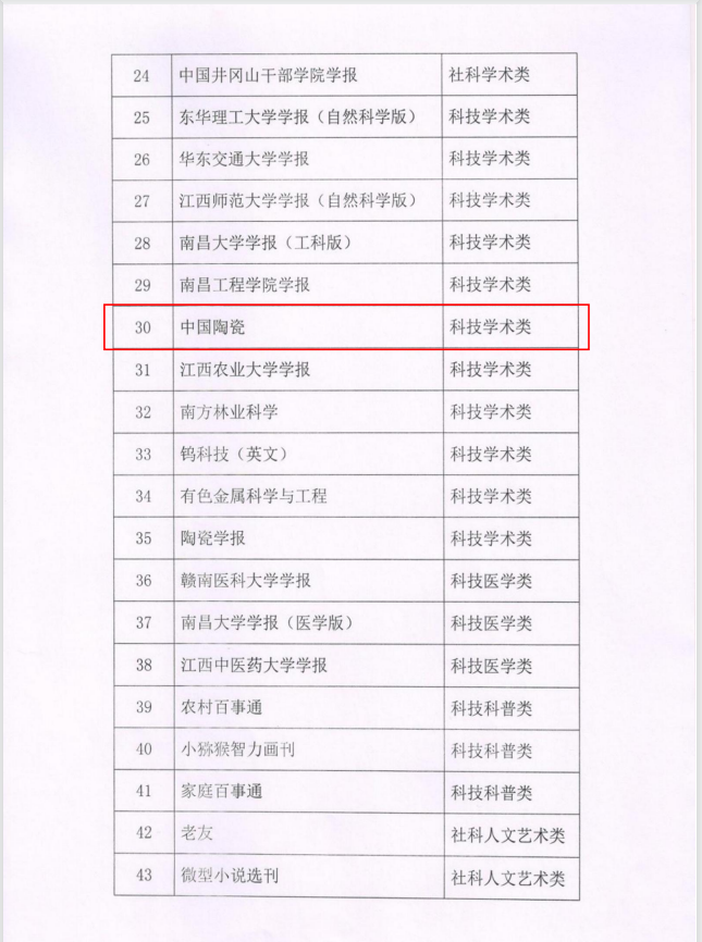 江西省期刊协会组织开展了“江西省优秀期刊”评选工作,经组织专家评选,报上级有关部门审核,共有53家期刊入选,《中国陶瓷》成功获选。